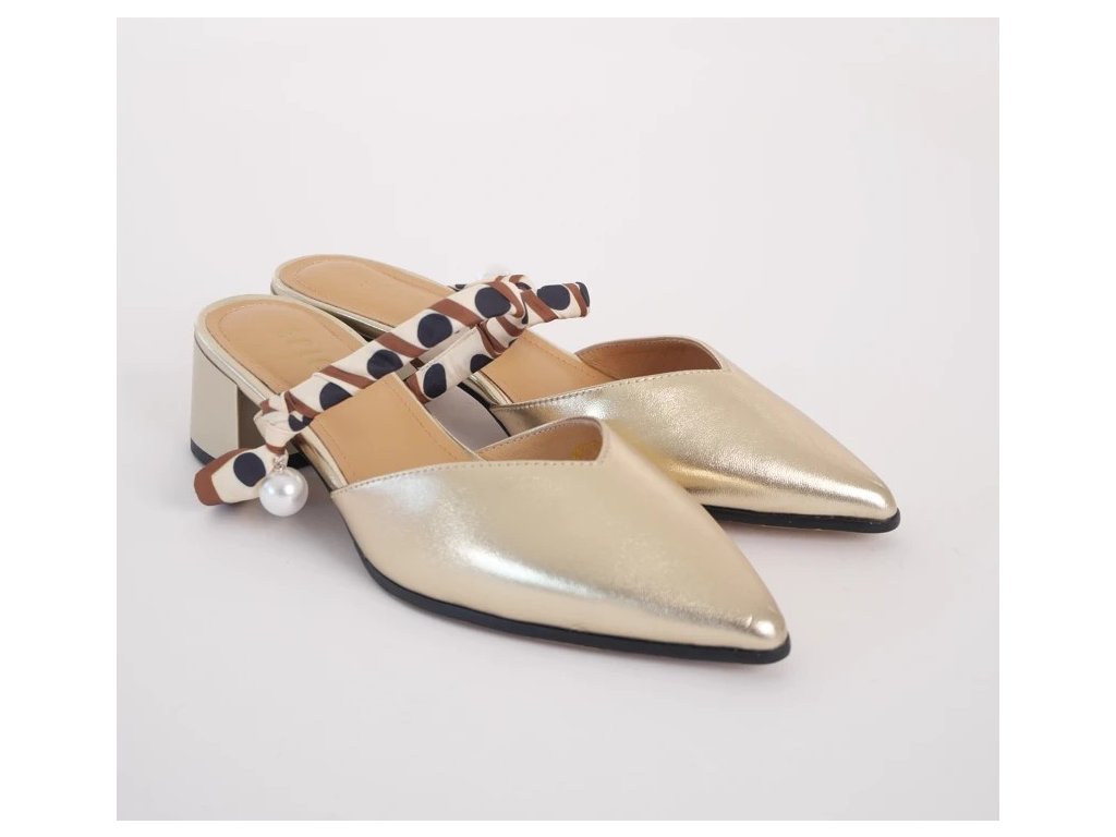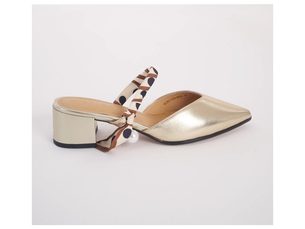 Kožené letní elegantní mules značky Epica s lichotivým střihem v módní zlaté a klasické černé barvě s elegantním zdobením přes nárt. Touch-it stélka.