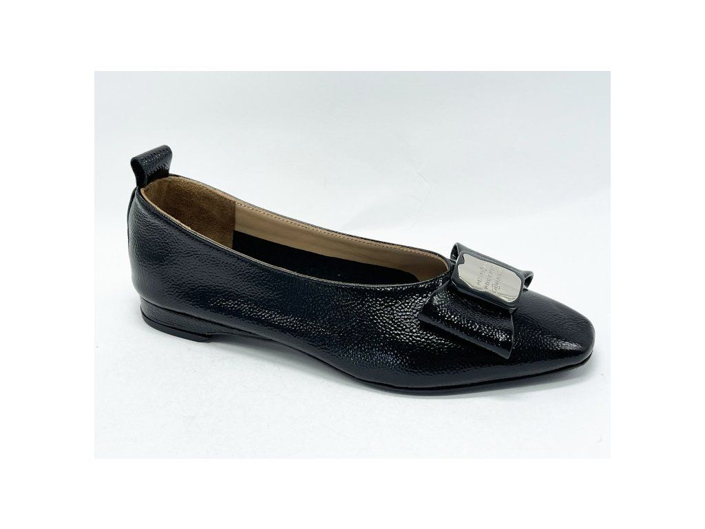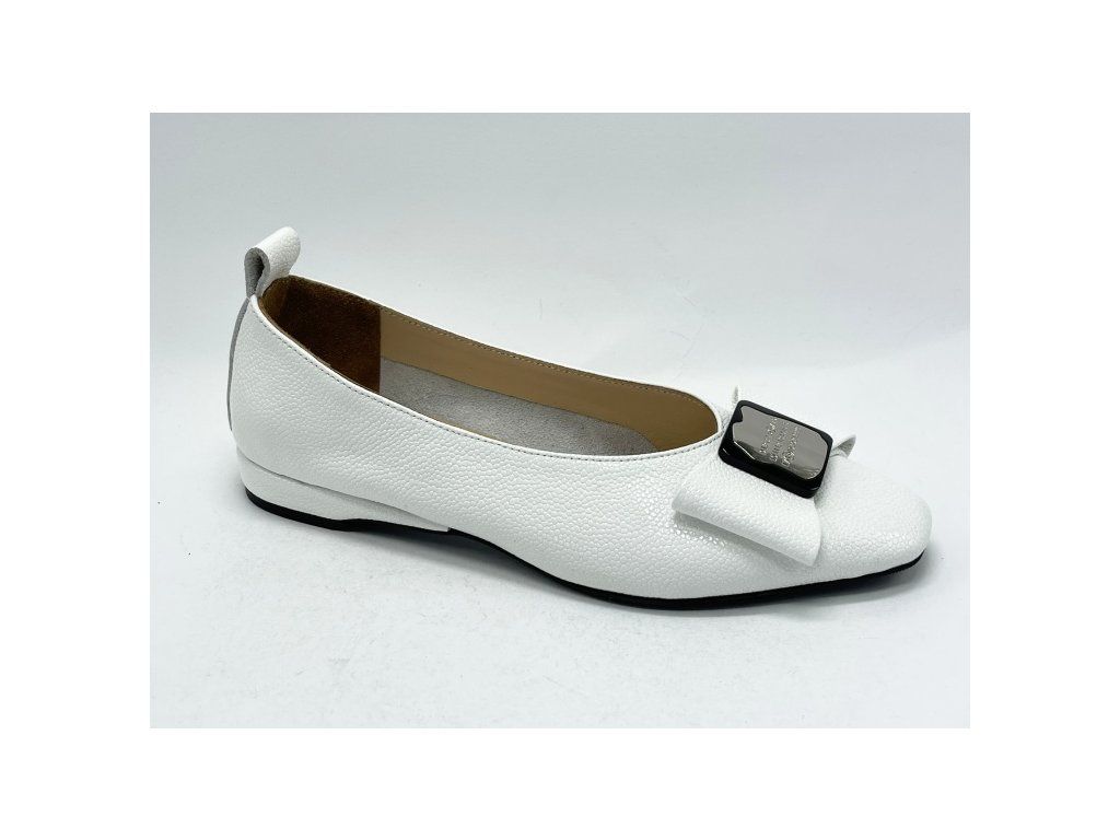Kožené lakované elegantní baleríny značky Guero s lichotivým střihem v bílé a černé barvě s jemnou mašlí.