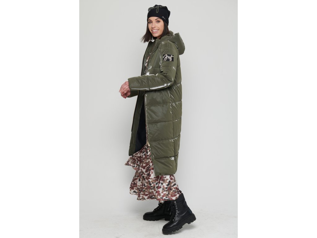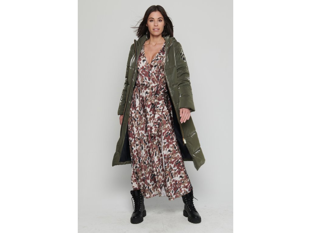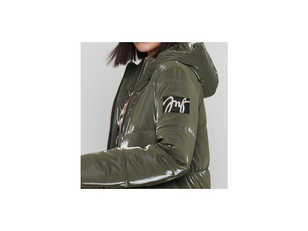Dlouhá prošívaná bunda z luxusního lesklého materiálu. Na rameni nášivka s logem INF. Zlaté zipy.