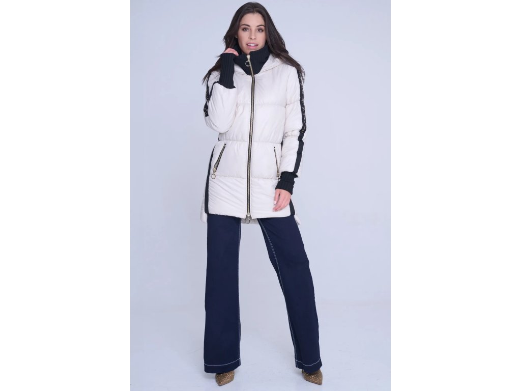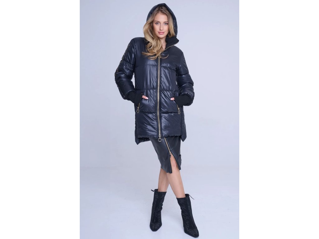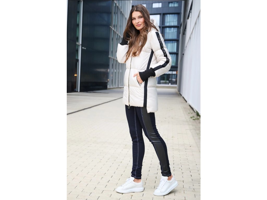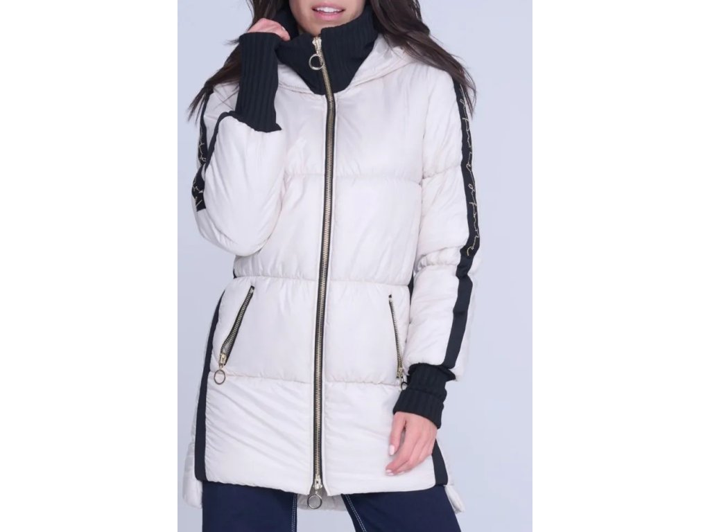 Luxusní zimní bunda v délce pod zadeček. Na rukávech efektní lampas s motivem Infinite ze zlatých crystalů Preciosa. Zlaté doplňky. Žebrové náplety ve výstřihu a v délce rukávů. Uvnitř bundy hřejivé, měkké rouno. Příjemné na nošení. Tuto bundu si obléknete a nebudete chtít sundat.