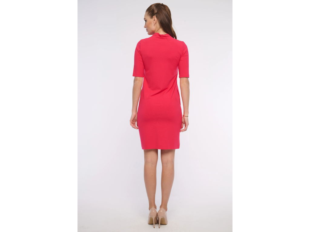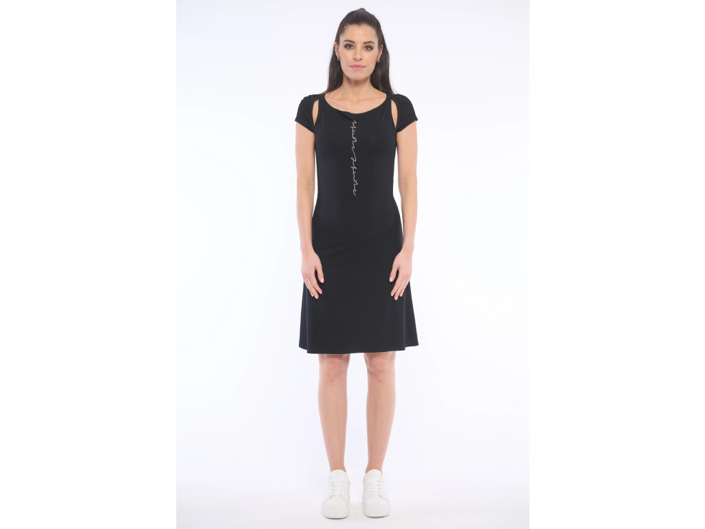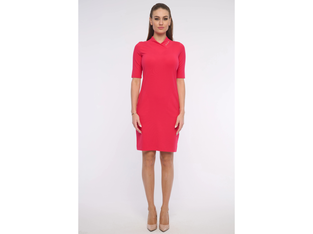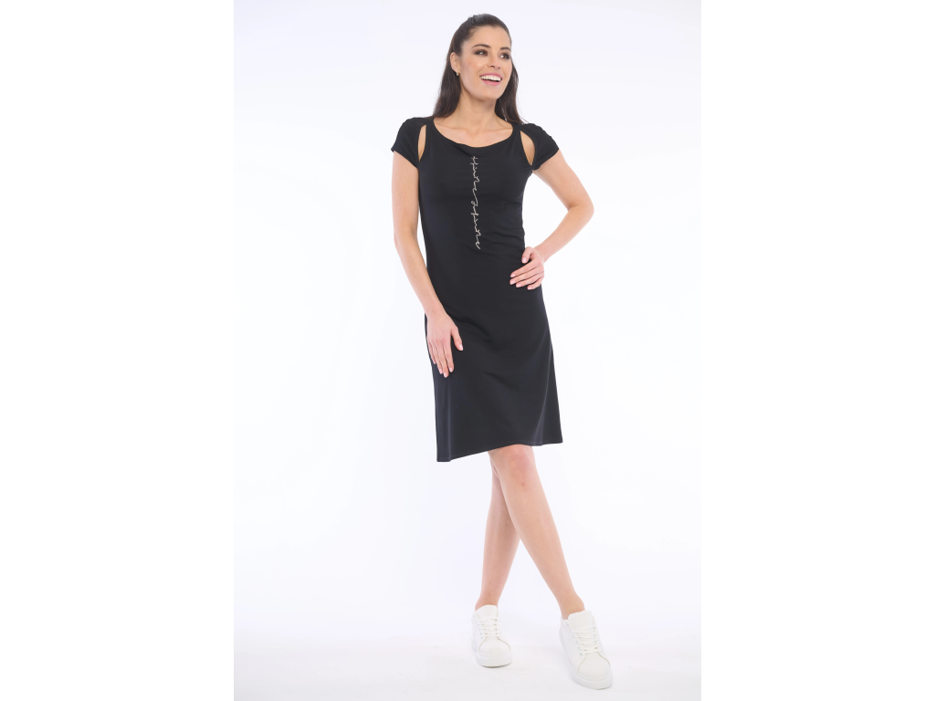 Šaty INF, kombinace hladkého úpetu s žebrovým, praktické kapsy na boku. Výrazným prvkem je přeložení ve výstřihu a logo z luxusních crystalů Preciosa. Dostupné ve dvou barevných variantách.