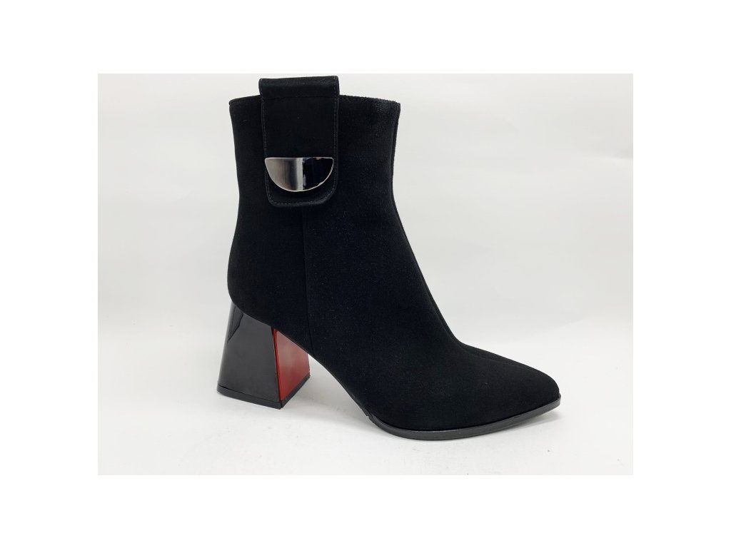 Kožené elegantní kotníkové boty s vyšším podpatkem, z vnitřní strany zdobený červeným dílem, z vnější jemnou sponou v tmavé barvě. Touch-it stélka a pohodlná výška podpatku.