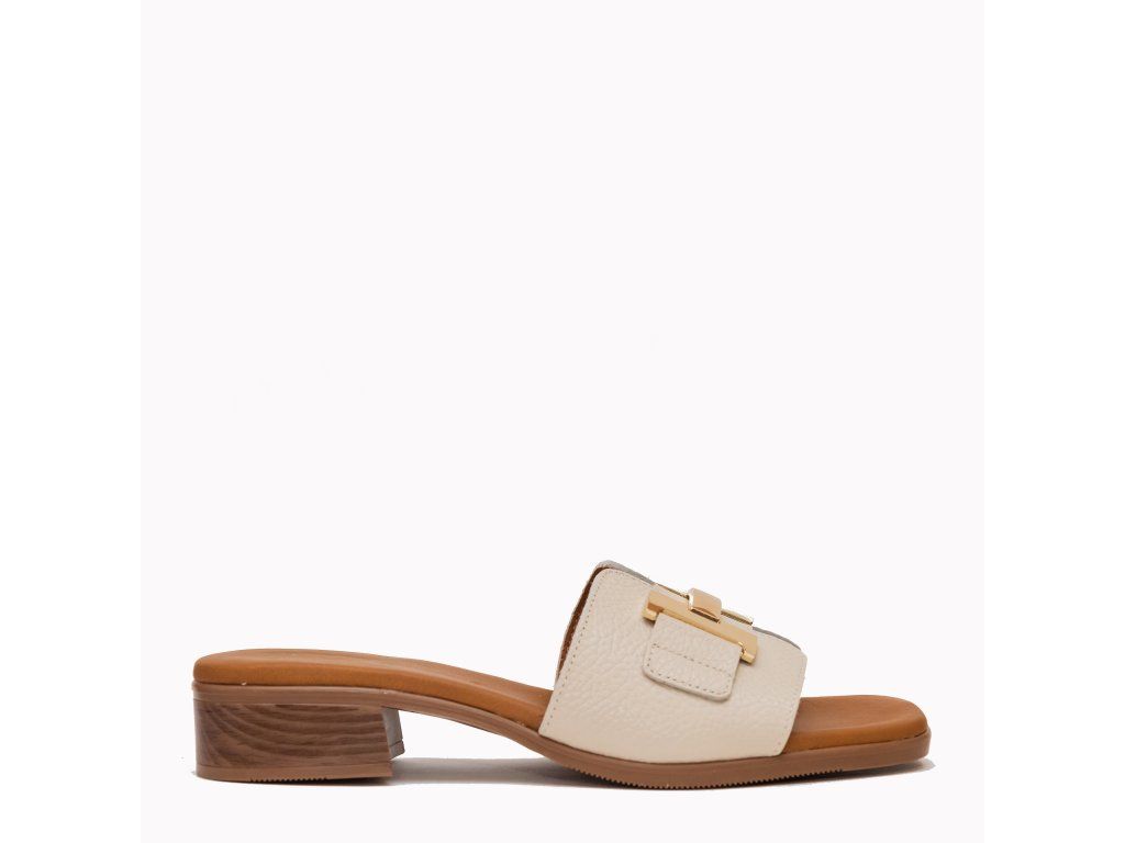 Kožené béžové pantofle španělské značky Oh! My Sandals, s jemným zlatým zdobením ve tvaru H na nártové části.