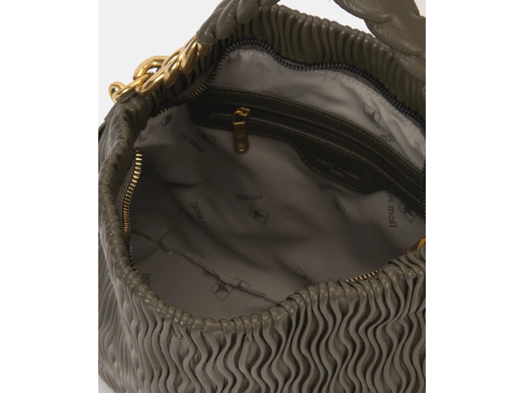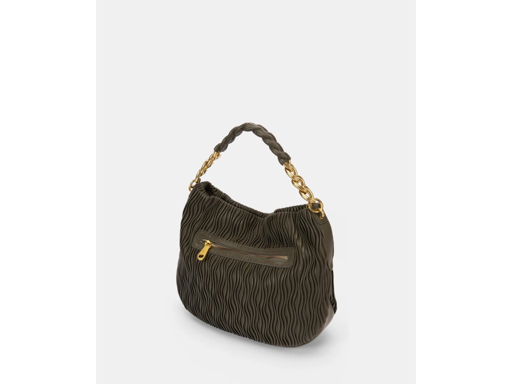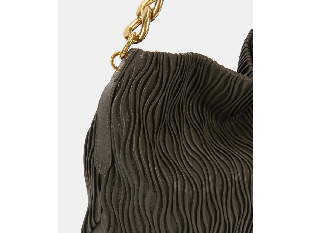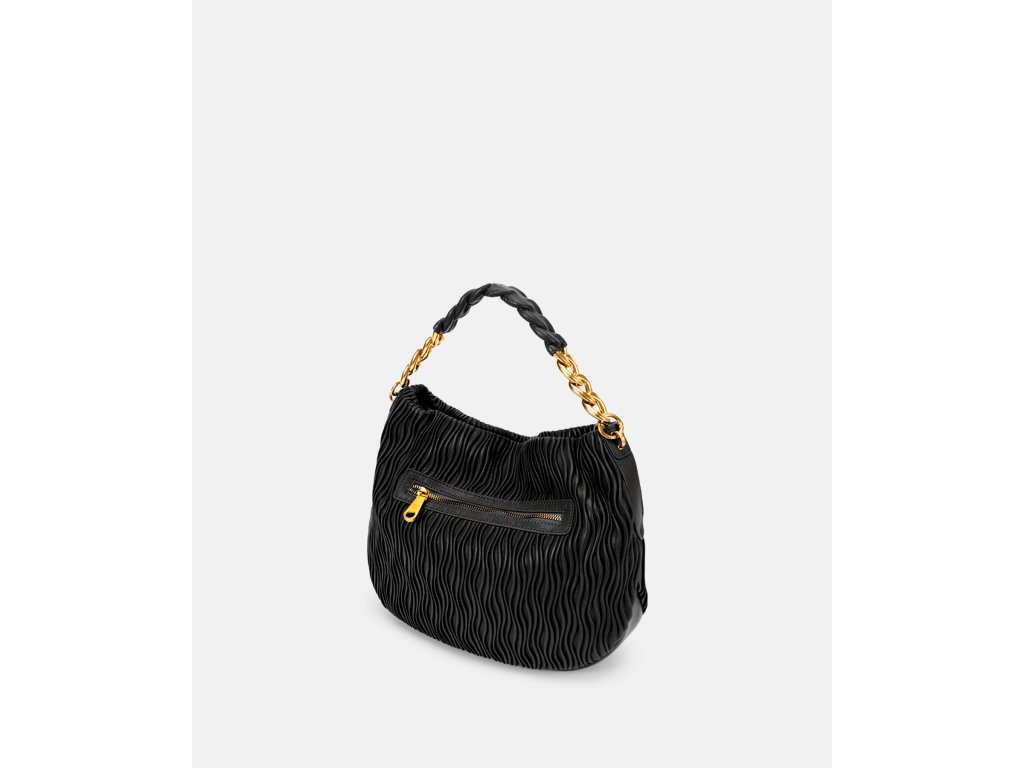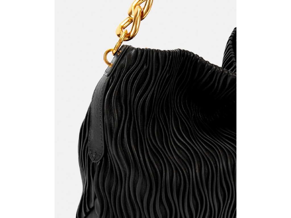 Hlavním prvkem této kabelky je její krátké držadlo, kombinace zlatého řetízku s pleteným dílem ve stejné barvě jako tělo kabelky. Design, který spojuje modernost a sofistikovanost, umožňuje ji nosit přes rameno s extra dávkou stylu.
